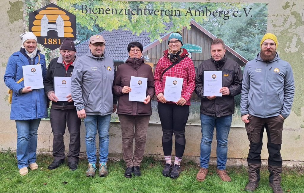 Am Lehrbienenstand des Bienenzuchtvereins Amberg e.V. haben die Teilnehmer des Neuimkerkurses 2025 erfolgreich ihre Ausbildung abgeschlossen. Auch in diesem Jahr wurde der Kurs angeboten, um Interessierten die Grundlagen der Imkerei näher zubringen. Insgesamt 14 Teilnehmer, darunter 9 Frauen, haben in 15 Theorie- und Praxisterminen wertvolle Kenntnisse in der Bienenhaltung und -behandlung sowie der Honiggewinnung erworben.
